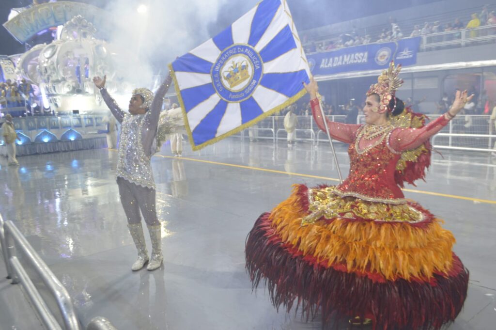 O Casal de Mestre-Sala e Porta-Bandeira Ronaldo e Leila Cruz realizou uma apresentação segura e elegante, respeitando os fundamentos do quesito, valorizando tanto a coreografia quanto a presença cênica ao longo do percurso.