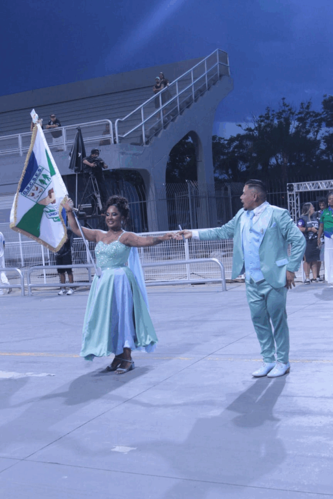O casal oficial, Edgard Carobina e Graci Araújo, mesmo com a pista ainda molhada, realizou sua coreografia com segurança e elegância, ostentando o pavilhão da escola.