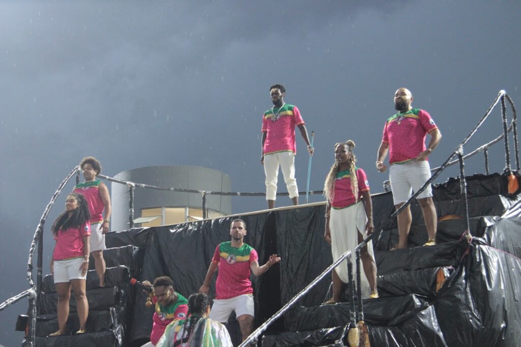 A comissão de frente, com coreografia assinada por Ghandi Tabosa, trouxe ao Sambódromo um elemento cenográfico e conseguiu manter vigor e sintonia em sua coreografia mesmo com a pista molhada.