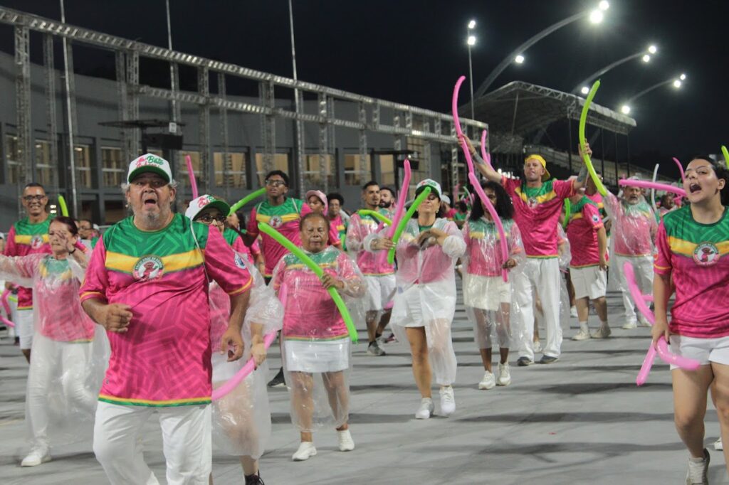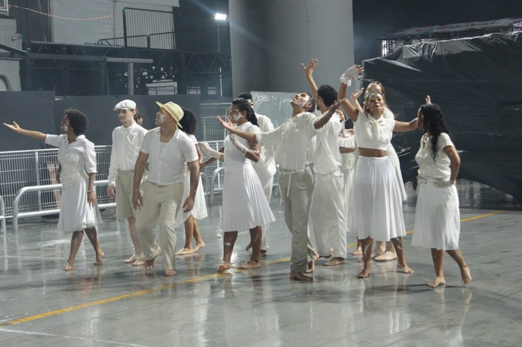 A comissão de frente, coreografada por Helena Figueira, apresentou uma coreografia vigorosa, simulando rituais característicos dos povos originários, despertando ainda mais a curiosidade do público presente.