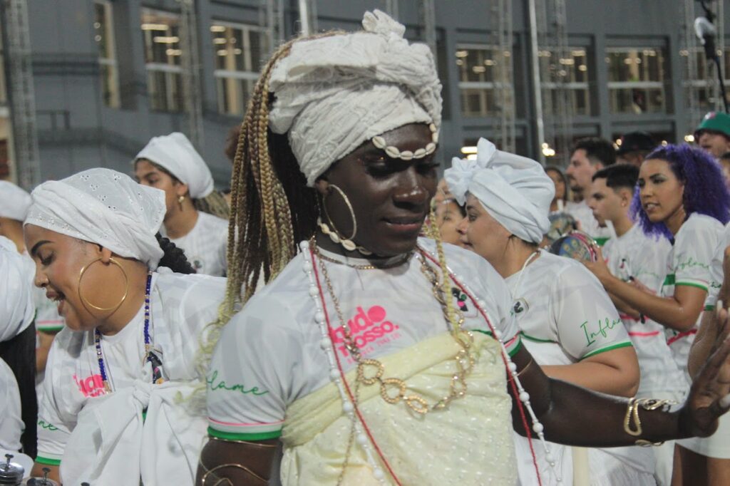 Durante o ensaio, diversos setores da escola trouxeram componentes com indumentárias que fazem referência aos povos originários, antecipando a estética e a narrativa que serão apresentadas no desfile oficial.