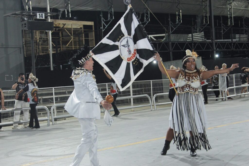O casal de Mestre-Sala e Porta-Bandeira Ruhanan Lucas e Ana Paula Sgarbi demonstrou experiência e sintonia na condução do pavilhão oficial, com figurinos que remetem às cartas psicografadas do homenageado.