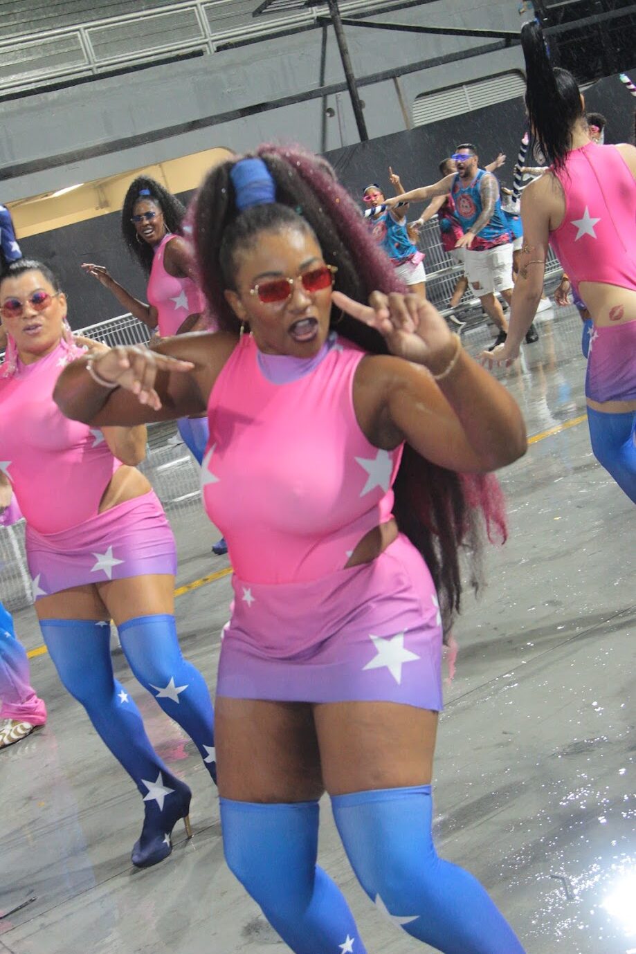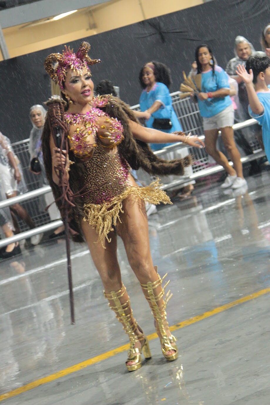Musas e destaques da escola também superaram as dificuldades impostas pela chuva e riscaram o chão da avenida com garra e empolgação.