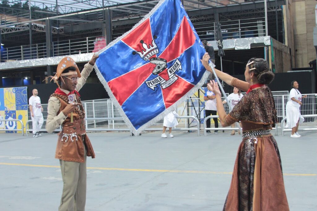 O casal de mestre-sala e porta-bandeira Luã e Estefani conduziu o pavilhão oficial da escola com sintonia, elegância e segurança, contribuindo para a harmonia do conjunto apresentado.